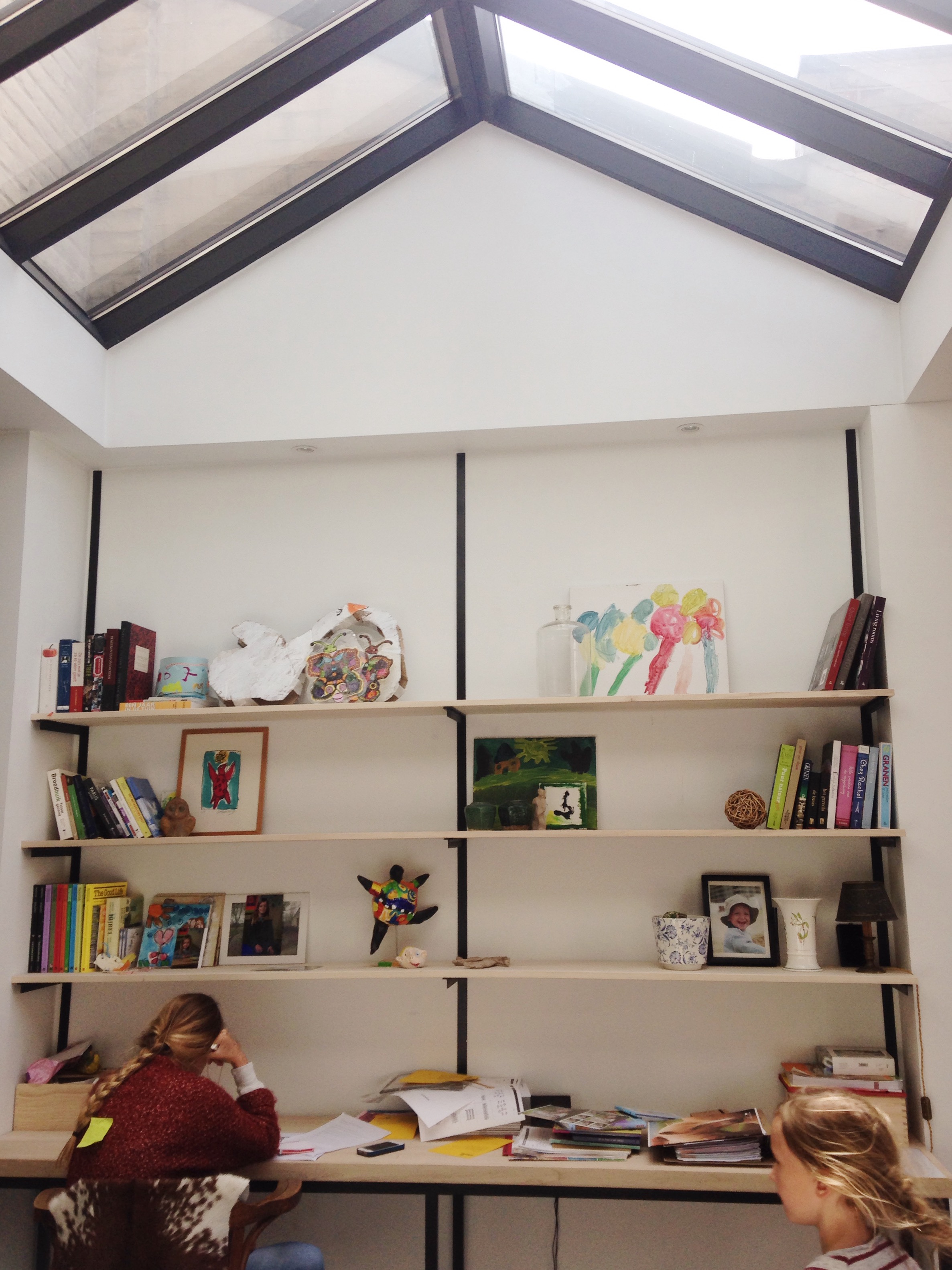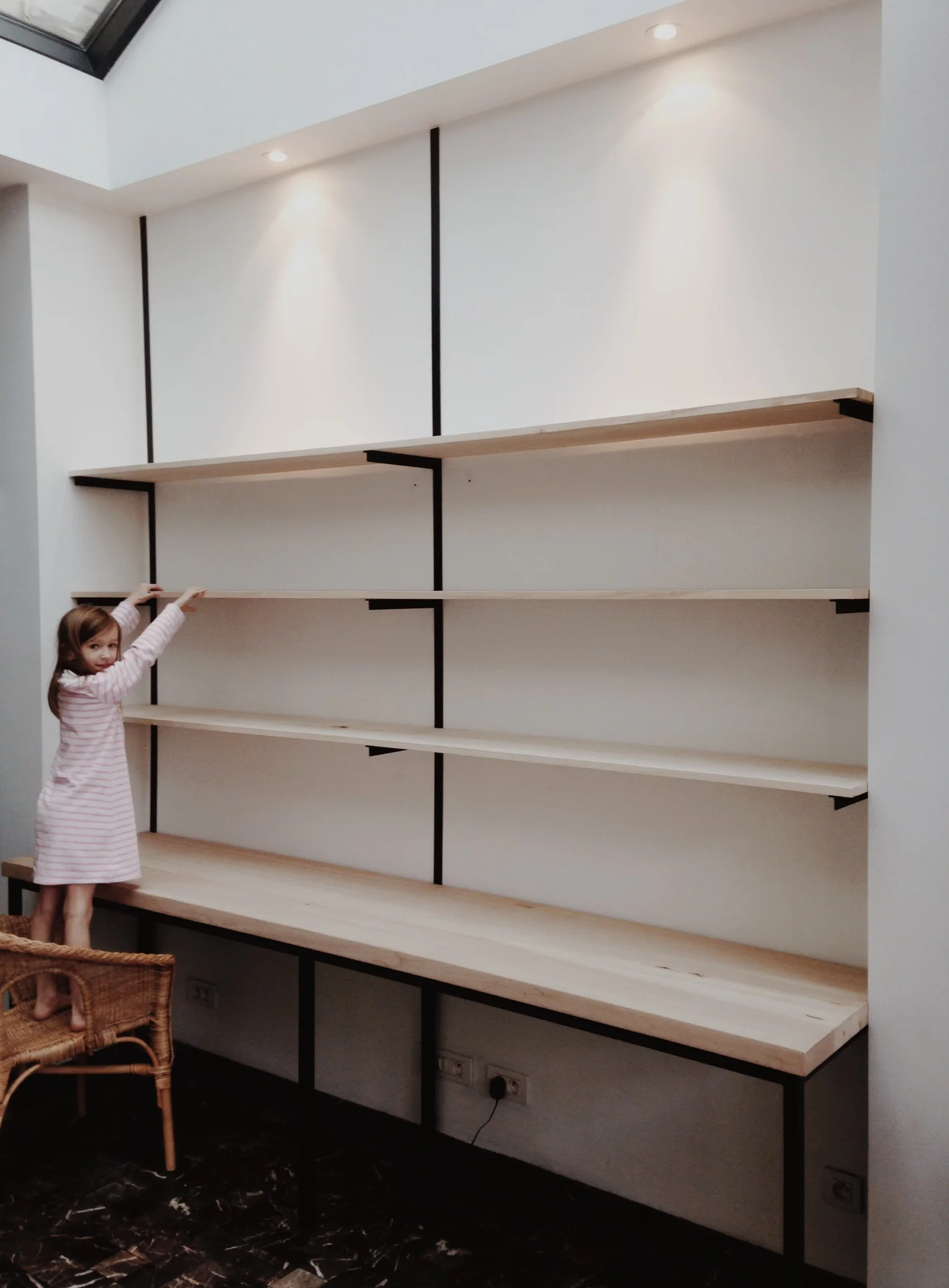 Although here it is featured against a wall it can also be used as a stand alone desk (shelving comes separately, please enquire for more information and prices).