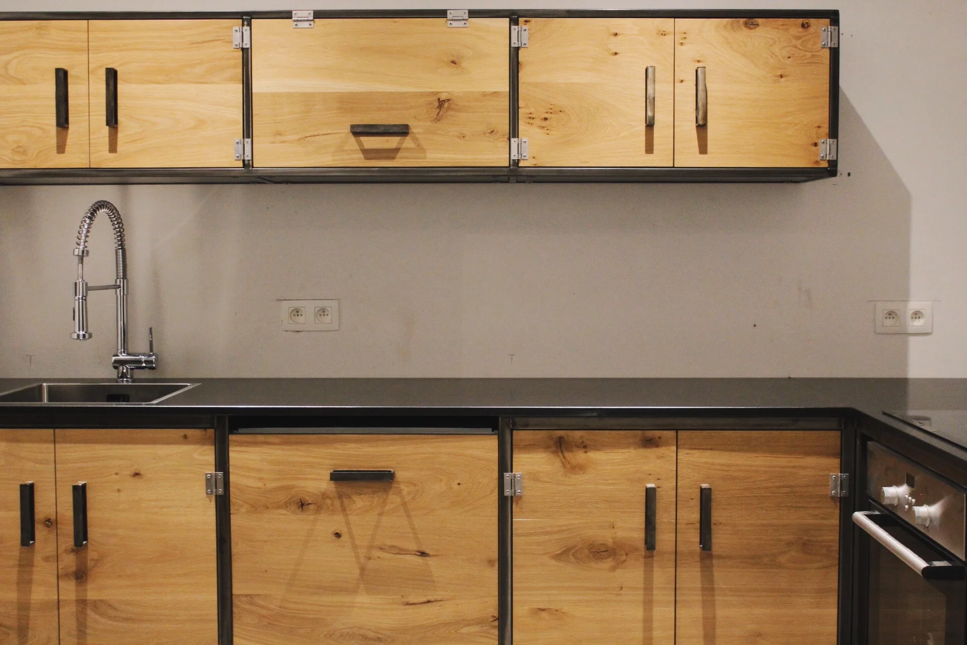 A unique hand brushed steel kitchen with oak tops. All drawers and doors are push to open with soft close as this client had little children and didn’t want little fingers to get caught. (A work in progress whilst the work by other tradespeople is delayed.)